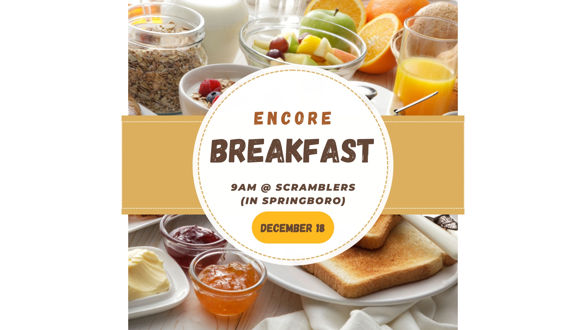In addition to special events, our Encore group for those 50+ meets for breakfast gatherings on the last Thursday of each month. The location is Scramblers in Springboro.